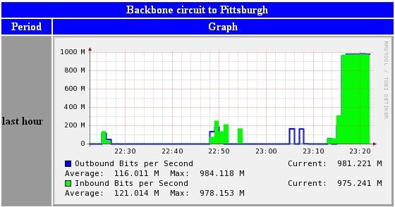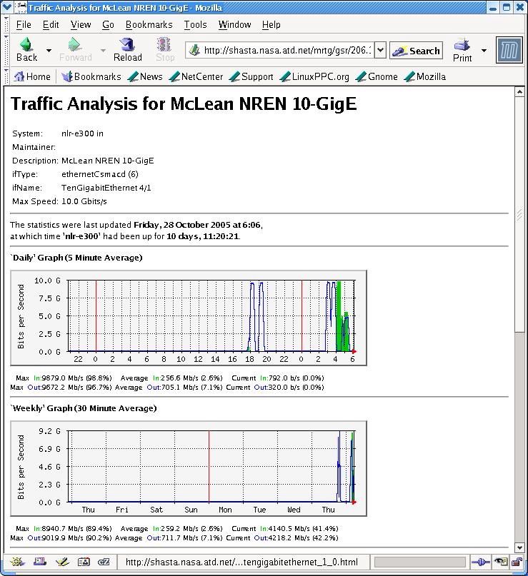 - On October 26, 2005, NREN's Mark Foster (ARC) tested the readiness for production use of NREN's new 1-Gbps end-to-end link between ARC and GSFC. Besides being 1-Gbps end-to-end, a key difference of this new link (versus NREN's present production link between ARC and GSFC which traverses Qwest's ATM-based Layer 2 service at ~100 Mbps) is that this new link traverses the NLR's GE/VLAN-based Layer 2 service between NREN's Cisco 6506's in Sunnyvale and McLean. Using Bill Fink's nuttcp throughput performance testing software for test data generation and UDP-transmission, Foster transmitted over 1.5 terabytes (TB) of data in each direction in 4 hours with single-direction throughputs of ~1-Gbps. A mrtg-generated timeline graph of the first few minutes of the traffic flow between Pittsburgh and McLean on NLR's Layer 2 service measured by NLR's NOC is provided.