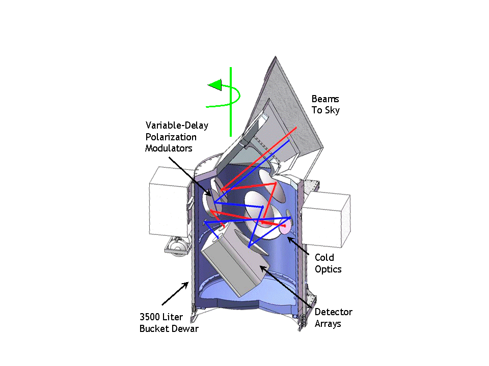 The Primordial Inflation Polarization Explorer (PIPER) is a balloon-borne instrument to measure the linear polarization of the cosmic microwave background in search of the signal from primordial gravity waves excited during an inflationary epoch shortly after the Big Bang. The existence of a gravity-wave background at detectable levels is a generic prediction of inflationary models.The detection of these gravity waves through their unique signature in the polarization of the remnant light from the Big Bang would have profound consequences for both cosmology and high-energy physics. Not only would it establish inflation as a physical reality, it would also provide a measurement of the relevant energy scale, probing physics at energies over a trillion times higher than accessible through particle accelerators. PIPER uses several technologies developed at GSFC. It carries 5120 superconducting detectors using the Backshort Under Grid (BUG) architecture.A variable-delay polarization modulator separates the incident radiation into unpolarized, linearly polarized, and circularly polarized components:PIPER will map over half of the sky in both linear and circular polarization.To reduce heat emission from the instrument itself, the twin telescopes are cooled to 1.5 K within a large (2 m diameter) open-aperture liquid helium dewar. PIPER will fly from a high-altitude scientific balloon at altitudes of 37 km in order to avoid emission from the Earth's atmosphere. The first of several planned flights will occur in 2012 from NASA's Columbia Scientific Balloon Facility launch site in Ft Sumner, New Mexico. | ||